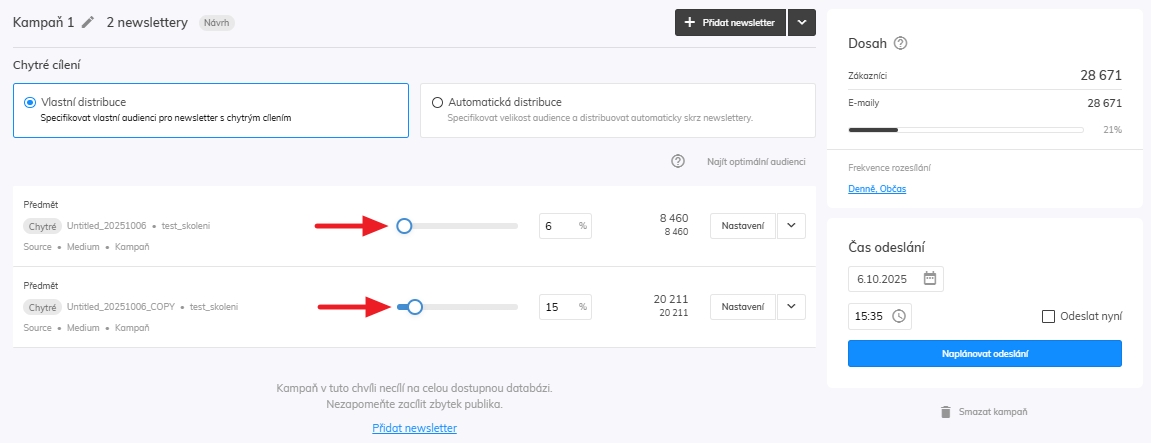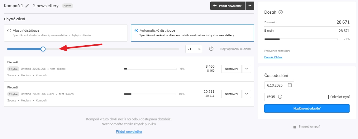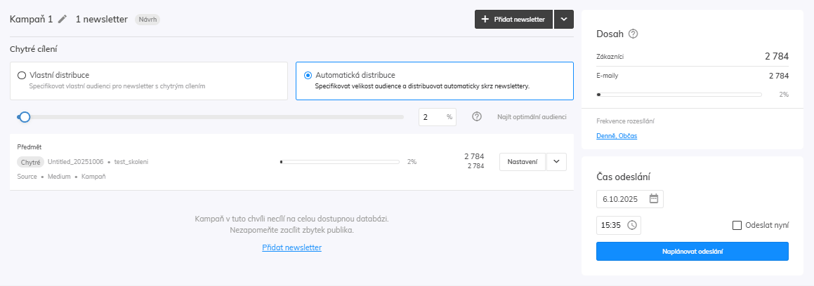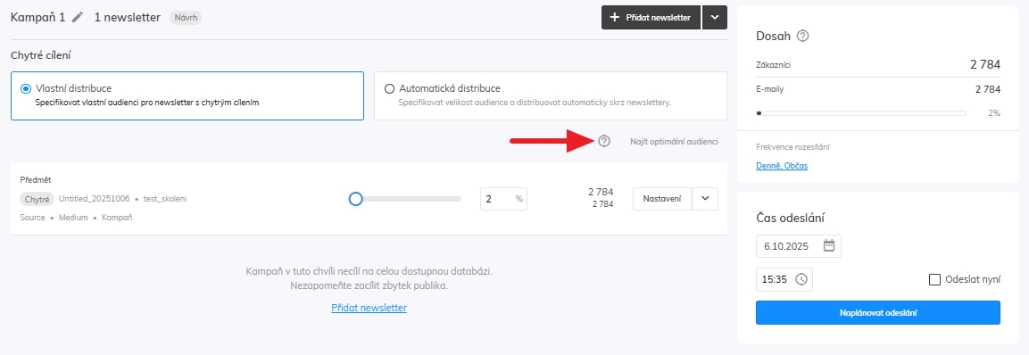V posledním kroku nastavíme naši Distribuci. Tu můžete zvolit a upravit přímo v nastavení kampaně, v přehledu jednotlivých newsletterů. Zde můžete nastavit množství audience, na kterou bude newsletter zacílen. Výběrem možnosti Najít optimální audienci spustíte algoritmus Samby, který najde nejlepší audienci pro vaše produkty.