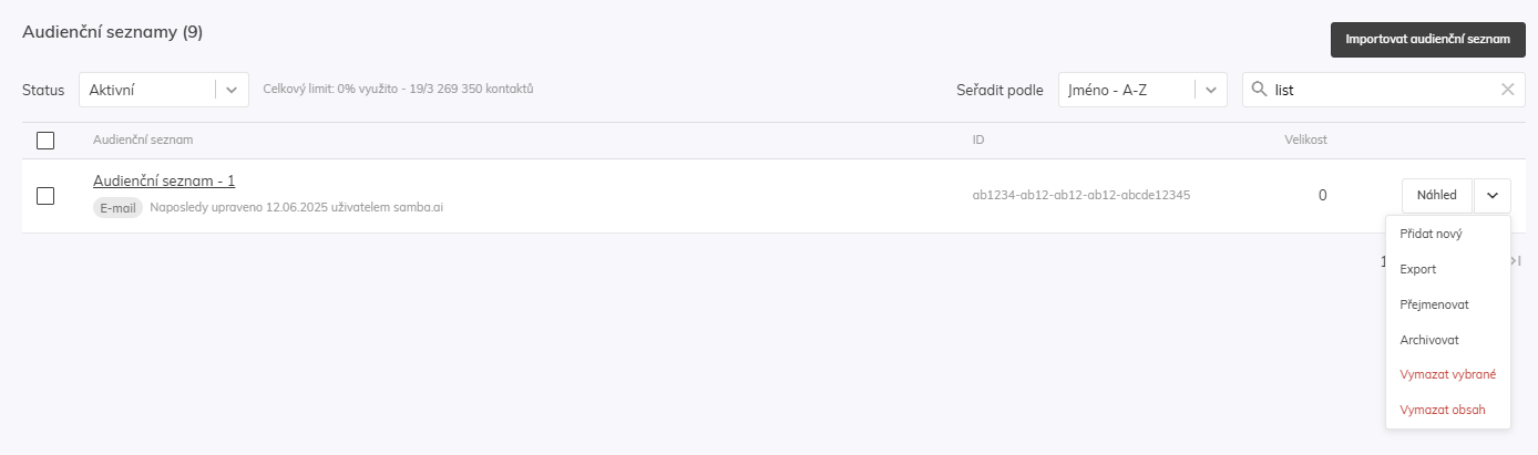 Při překročení celkového limitu nebude umožněno nahrávat další seznamy – doporučujeme využít funkci Vymazat obsah u nepoužívaných seznamů. Do celkového počtu se započítávají aktivní i archivované audienční seznamy.