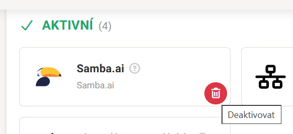 Pokud budete chtít doplněk Samba.ai odinstalovat, stačí si v administraci vašeho e-shopu otevřít sekci Doplňky > Seznam doplňků, zde najít Samba.ai a pomocí ikonky v pravém dolním rohu doplněk odinstalovat.