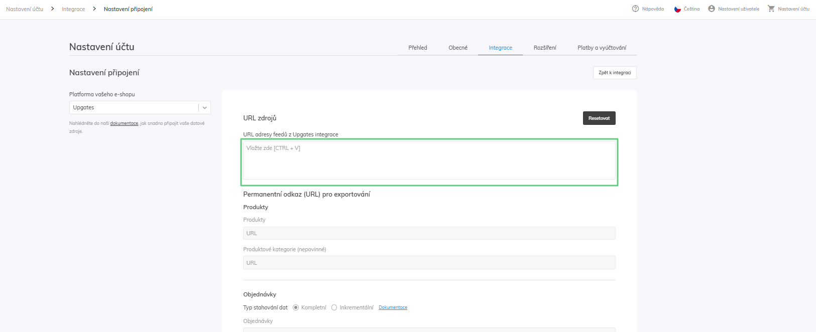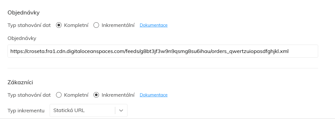 V této sekci máte vygenerované URL adresy jednotlivých inkrementálních feedů – objednávkový a zákaznický – každý se nastavuje zvlášť. Začneme s objednávkovým feedem: