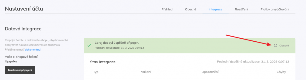 V administraci vašeho účtu v Samba.ai můžete úspěšnost této implementace zkontrolovat v sekci Nastavení e-shopu > Integrace.