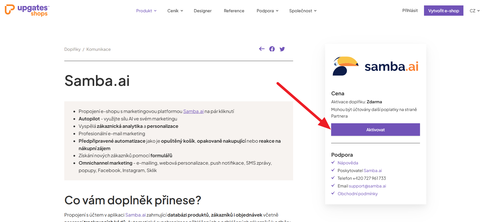 V Upgates Marketplace najděte náš doplněk Samba.ai doplněk pro Upgates a klikněte na Aktivovat.