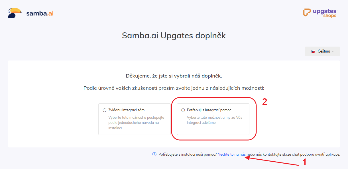 Nemáte čas nebo nejste si jisti, jak na to? Žádný problém! Stačí v nastavení doplňku vybrat možnost Potřebuji s integrací pomoc, poslat nám své kontaktní údaje a my za vás integraci dokončíme. Případně se nám rovnou ozvěte na support@samba.ai.