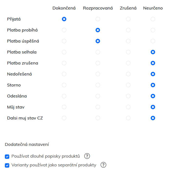 Dále je zde možnost nastavit tzv. dodatečná nastavení. Ty obsahují volbu mezi využíváním dlouhých a krátkých popisků a používání produktových variant jako separátních produktů.