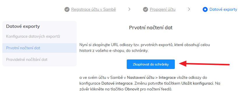 Zde vám doplněk nabídne URL odkazy tzv. prvotních exportů. Tyto exporty obsahují data za celou historii vašeho e-shopu. Odkazy si lehce zkopírujete najednou pomocí modrého tlačítka „Zkopírovat do schránky“ v doplňku.