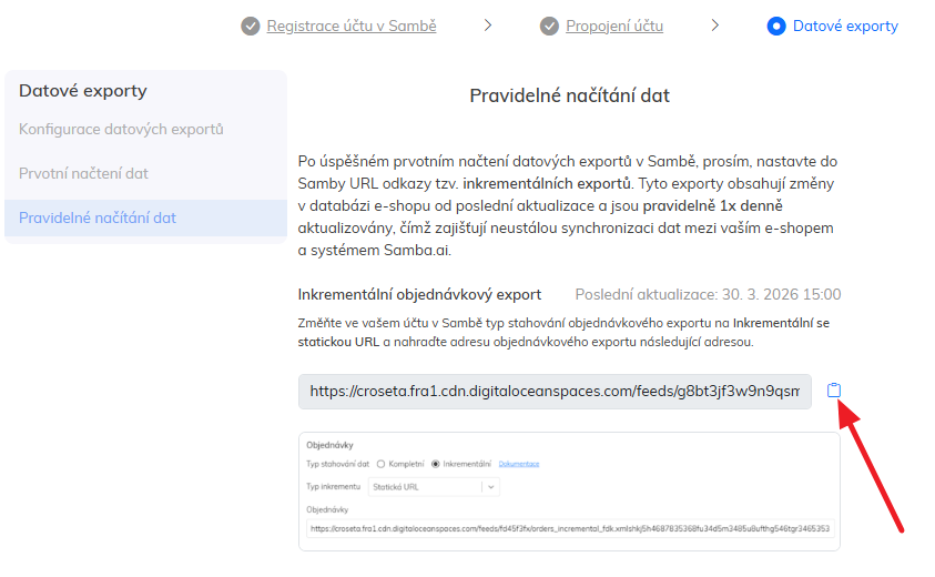 Po úspěšném prvotním načtení dat v Sambě, prosíme, přejděte na tzv. inkrementální exporty. Tyto exporty obsahují pouze změny z databází od poslední aktualizace dat a pravidelně probíhají 1x denně. Tím je zajištěna neustálá synchronizace dat mezi vaším e-shopem a systémem Samba.ai. Zároveň je díky tomu méně zatěžována infrastruktura a samotná aktualizace dat je rychlejší, protože nemusí pracovat s kompletní databází, ale pouze s inkrementem, což je vyžadováno samotným systémem Upgates.