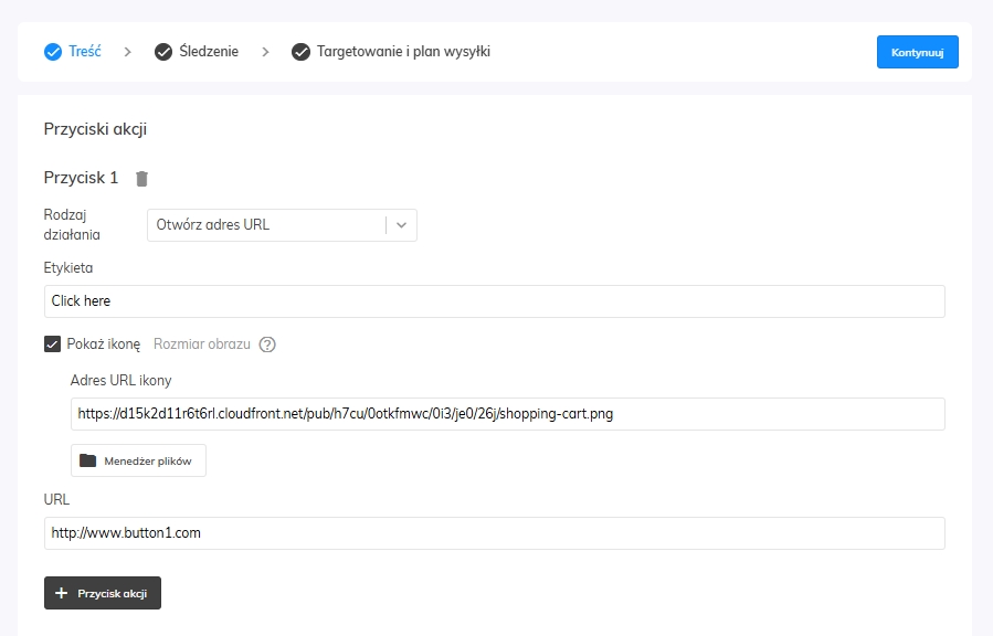 Każde powiadomienie push może zawierać maksymalnie dwa przyciski z określonymi ikonami, etykietami tekstowymi oraz (tylko w przypadku akcji „Otwórz adres URL”) również linkiem URL.
