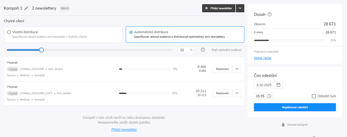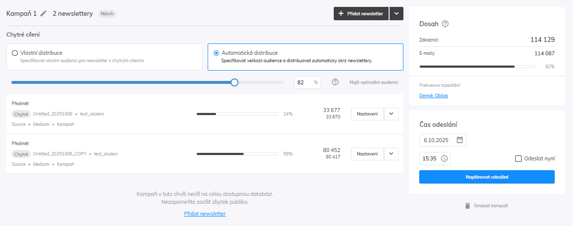 Můžete vybrat část audience s automatickou distribucí, kde hodnota změní distribuci Newsletteru s chytrým cílením.